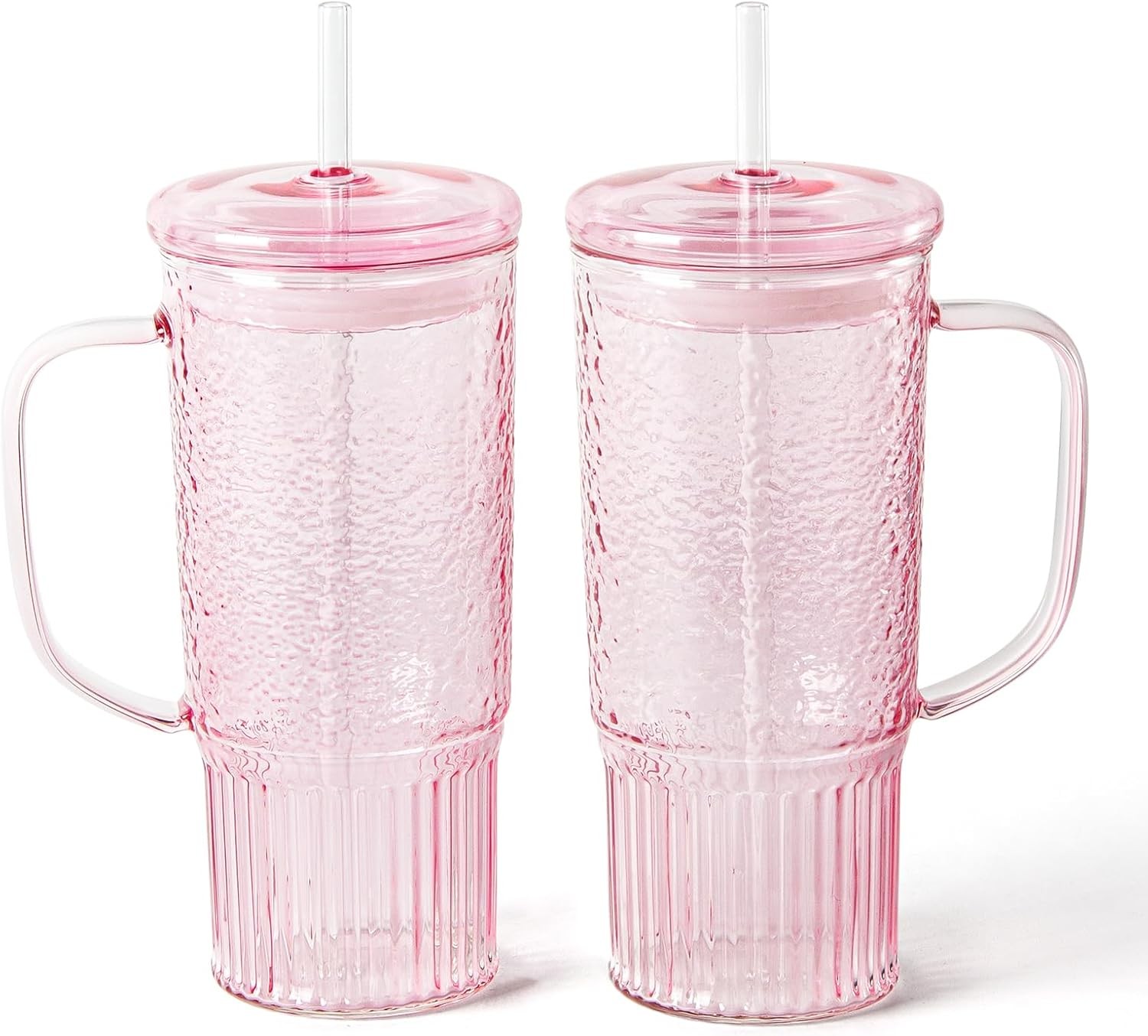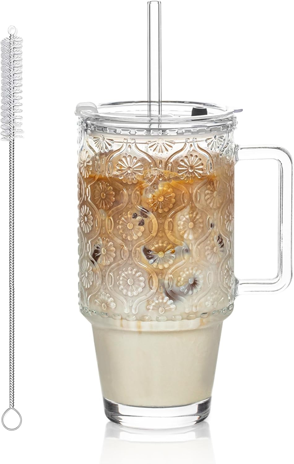 KEMORELA 24 Oz Glass Tumbler with Straw and Lid, Iced Coffee Cups with Lids, Sm