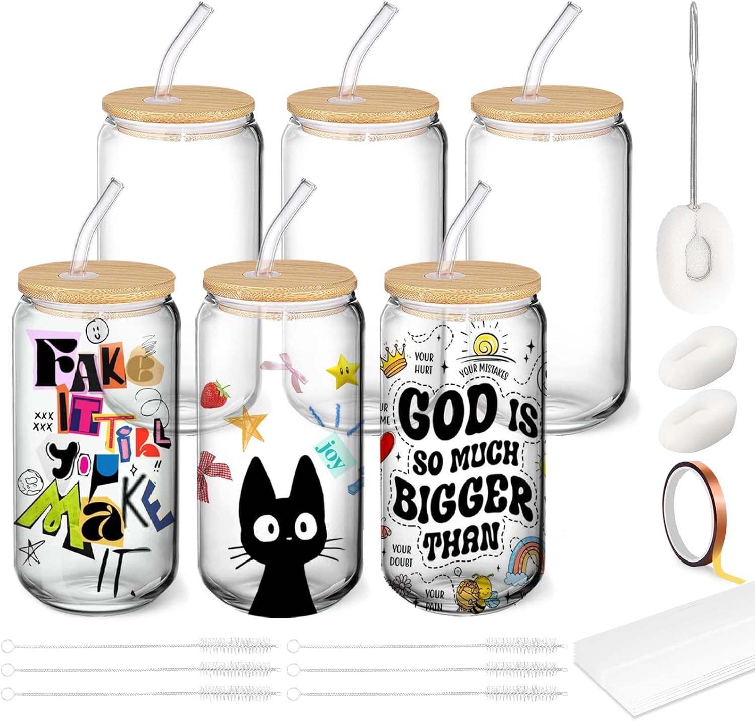 6 Pcs Thermal Transfer Glass Jar with Straw and Lid, Clear Mug for Cocktails, W