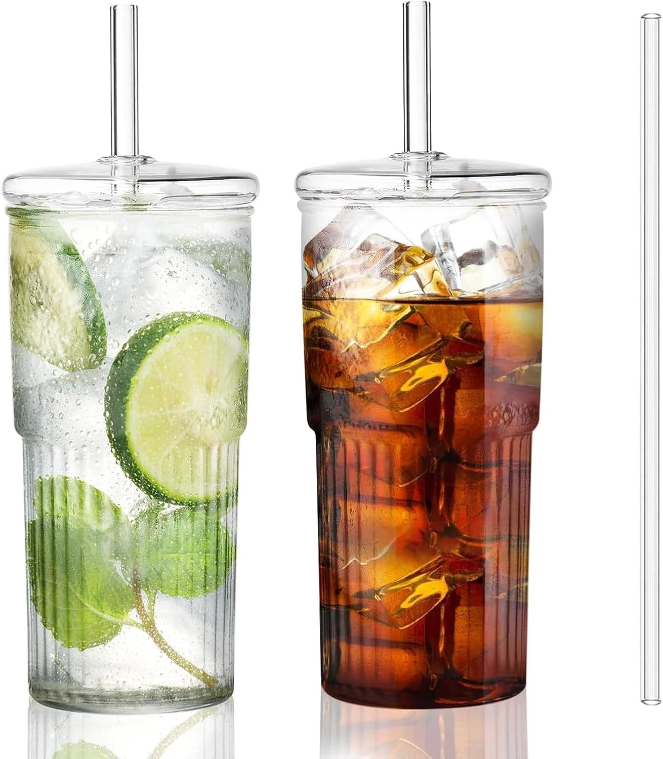 INSETLAN 2PCS 600ML Ribbed Glass Tumblers with Lids and Glass Straws, Leakproof Glass Cups, Coffee Glasses, Iced Coffee Cup, Glass Tumbler with Straw and Lid for Iced Coffee, Cocktail, Tea, Smoothie