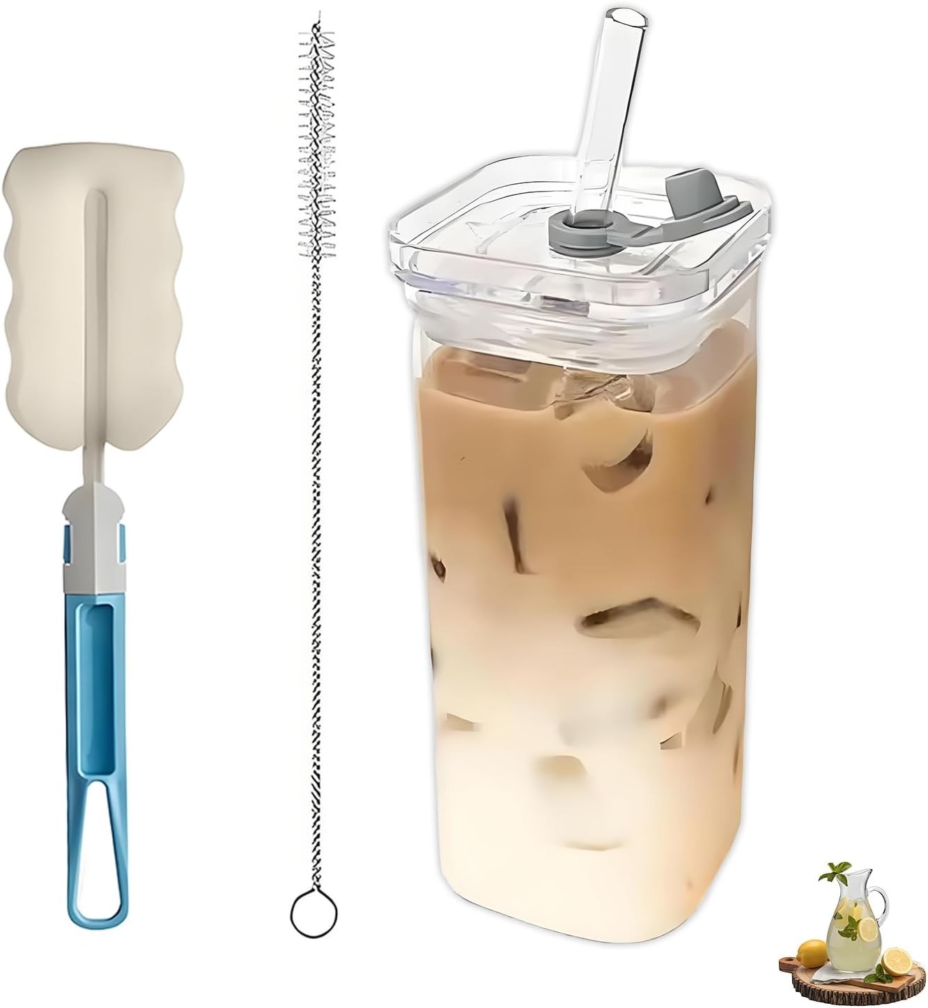 MHDCLY Glass Cups 20 oz,Glass Cups with Lids andStraws 4 pcs-Coffee Cups,Drinking Glasses Set,Glass Tumbler with Straw and lid Gift 2 Cleaning Brushes