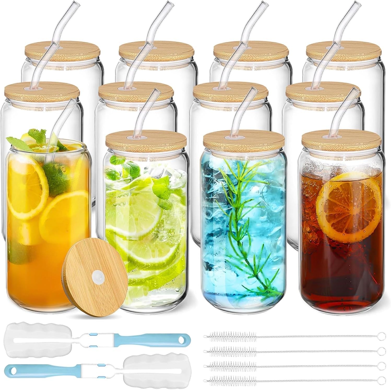 12 Pcs Drinking Glasses Cups with Glass Straw and Bamboo Lids - 16oz Beer Can S