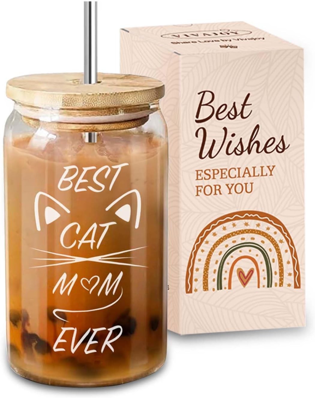 Cat Gifts for Women - Cats Lovers Gifts for Womens, Glass Cups with Straw and L