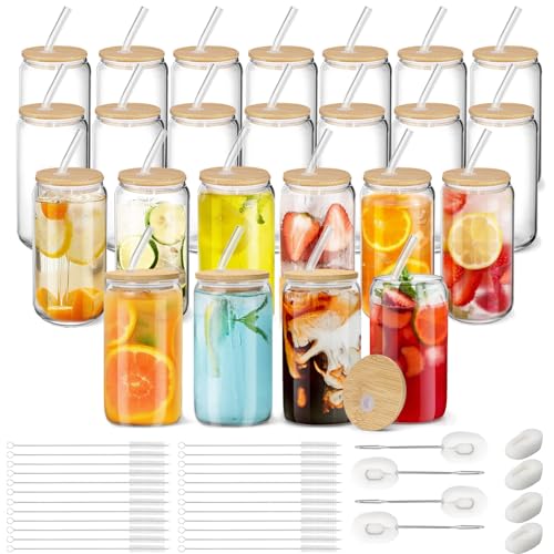 Cafultgo Smoothie Cups 24 Pack Glass Tumbler with Straw and Lid 16OZ Glass Cup Iced Coffee Cups Drinking Cup Set with Wooden Lids Home Essential Glass Tumblers for Beer Tea and Latte Clear