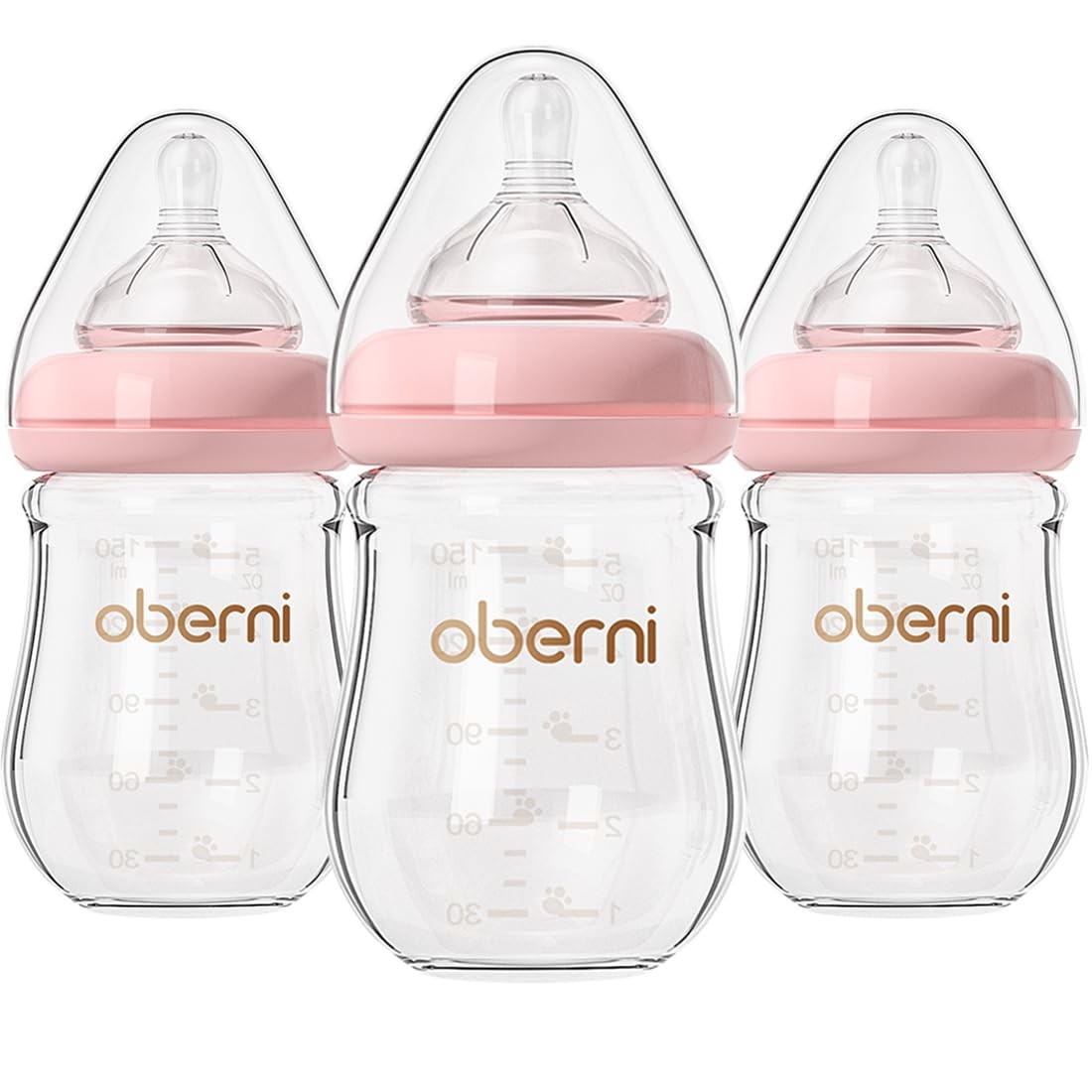 Oberni Anti-Colic Glass Baby Bottles with Slow Flow Breast-Like Silicone Teat, 150ml, 0+ Months, Wide-Neck, Pink/3Pack