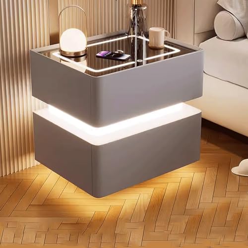 JDKJSBF Slim Bedside, Wireless Charging, Smart Sensor Light, No Installation Required, Exquisite Appearance, Tempered Glass Top, Bedside Table with Drawers (Colour: Grey, Size Thoughtful