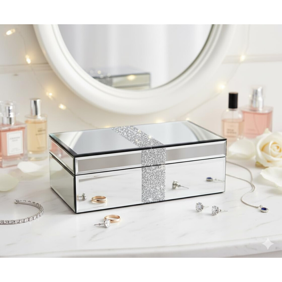 SERENA'S ® Silver Crushed Diamante Mirrored Glass Jewellery Box Makeup Organis