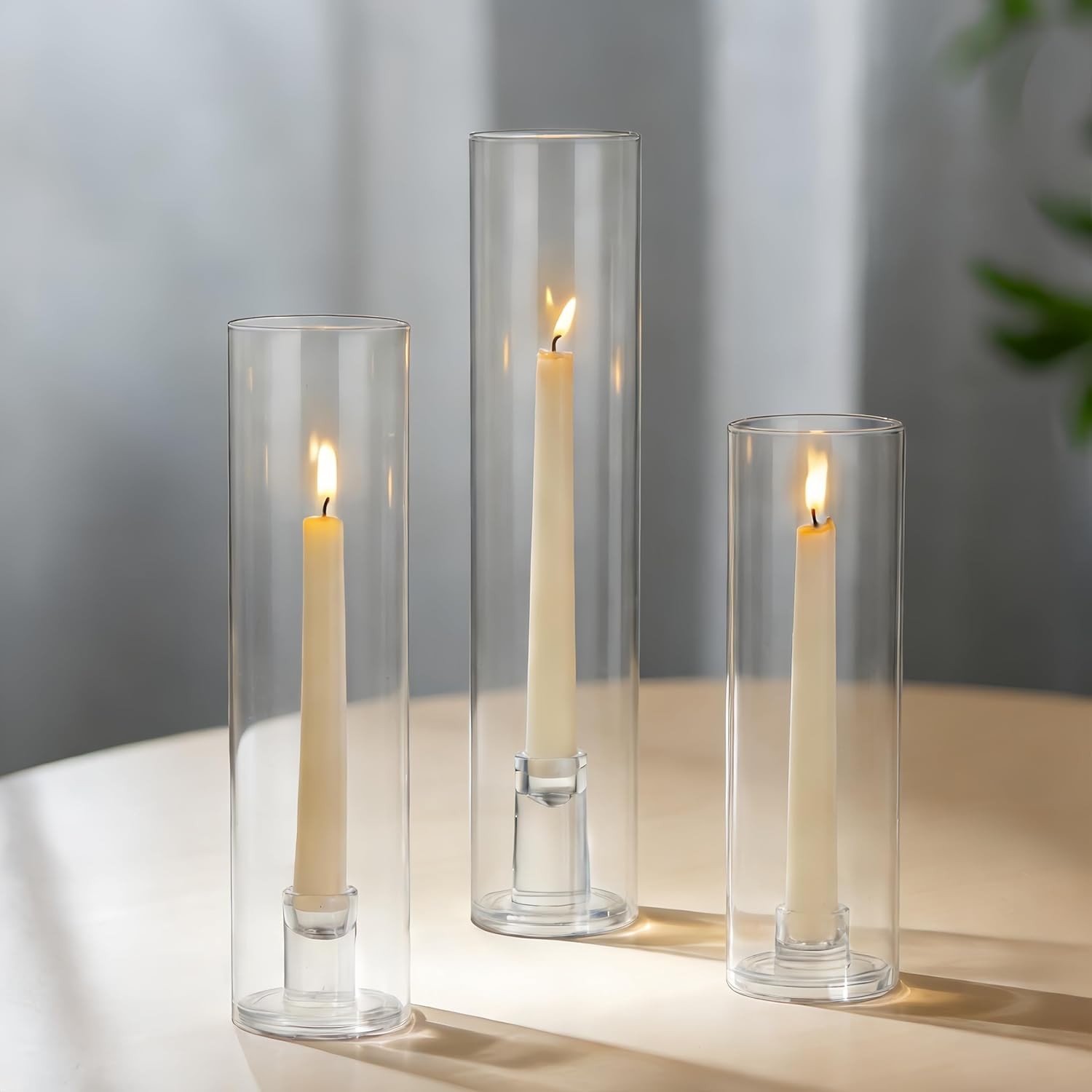 Glass Hurricane Candle Holder, 3pcs Clear Cylinder Candle Holders Bulk for Pillar Candles, Open Ended Glass Candle Pedestal for Wedding Centerpieces Tables, Party, Event(No.01)