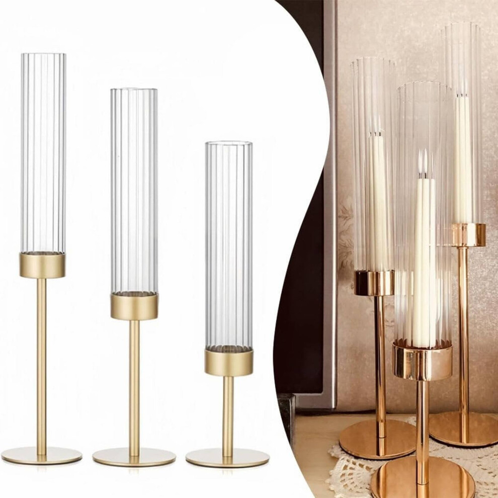 Gold Glass Hurricane Candle Holders, Tall Clear Cylinder Taper Candlesticks â Wedding, Party, Christmas Decor Set of 3