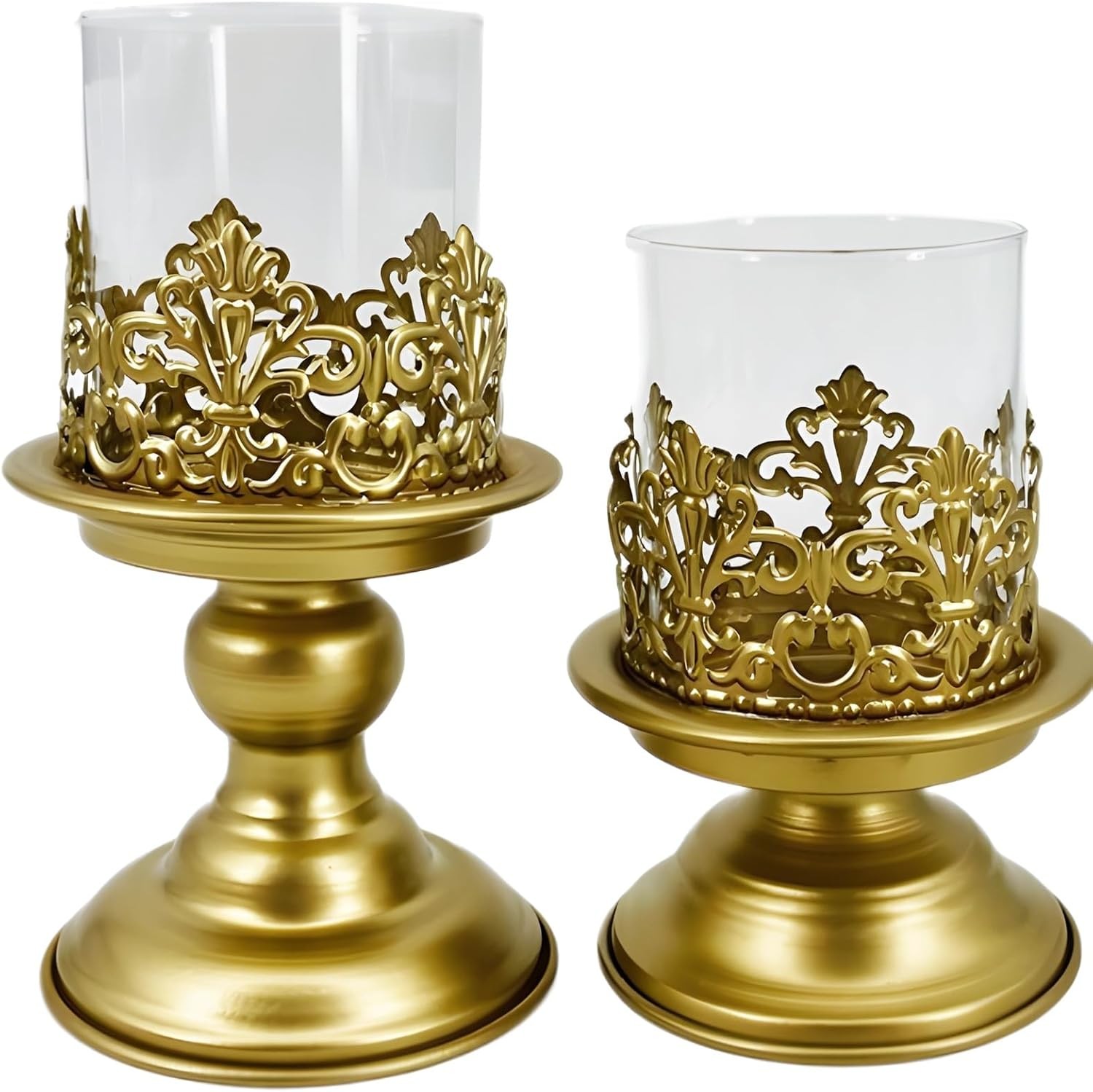 FLXHSA Gold Candle Holders Set of 2 for Glass Pillar - 3.5in and 4.3in Hurricane Candlestick Holder Home Decor,Table Centerpiece