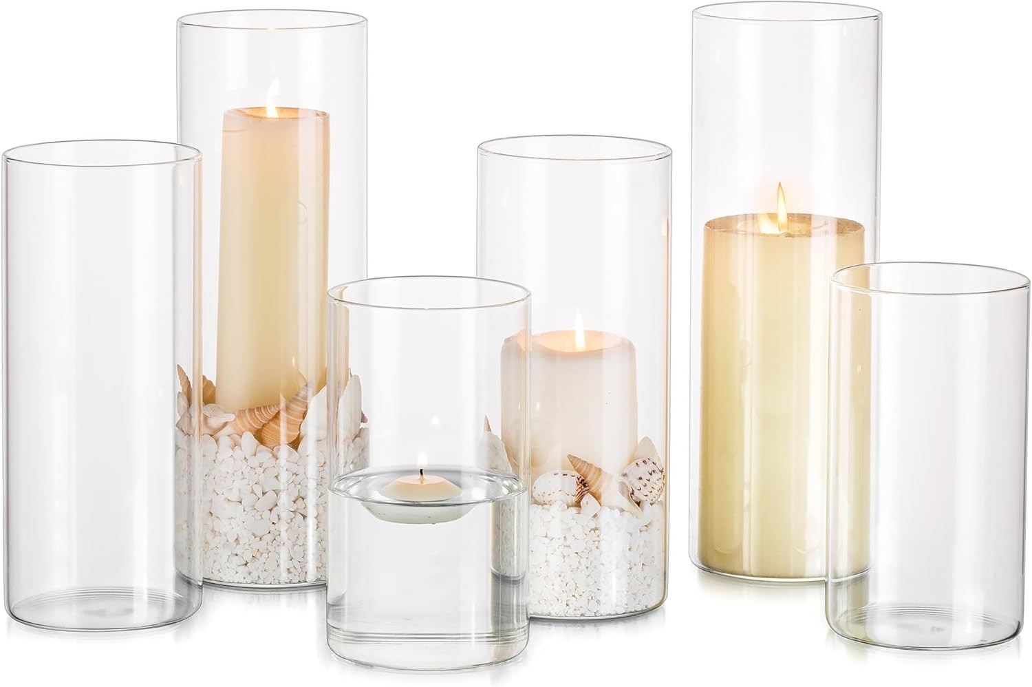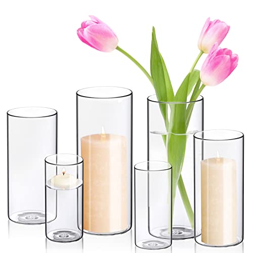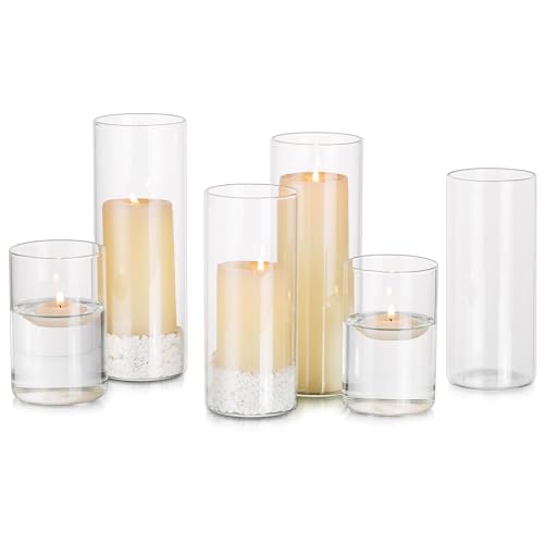 Glasseam Pillar Candle Holder Set 6, Floating Candle Holders for Tealigh Votive Candles, Hurricane Glass Candle Holders for Wedding Centrepiece, Flower Vases for Living Room Dining Table Decorations