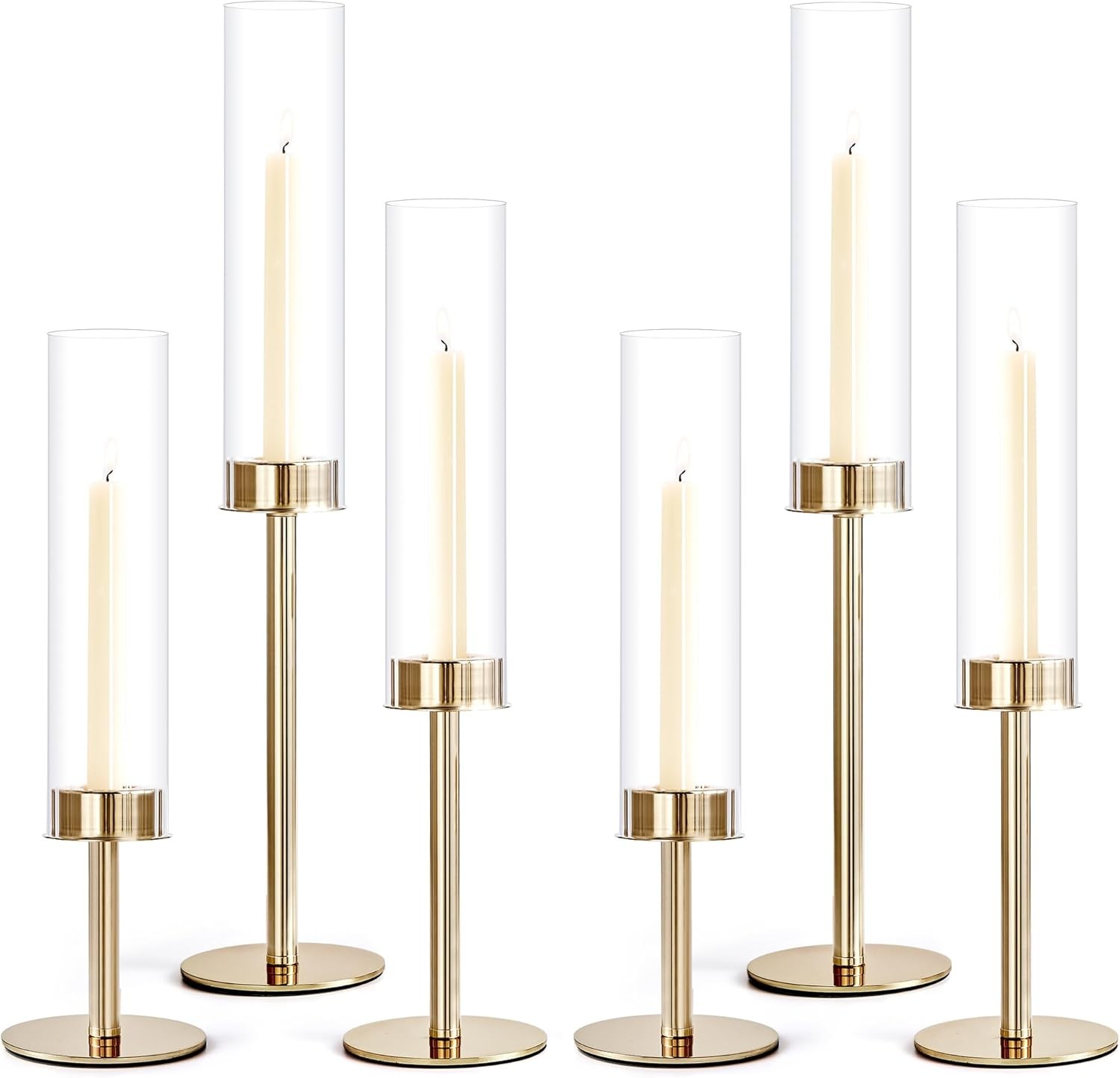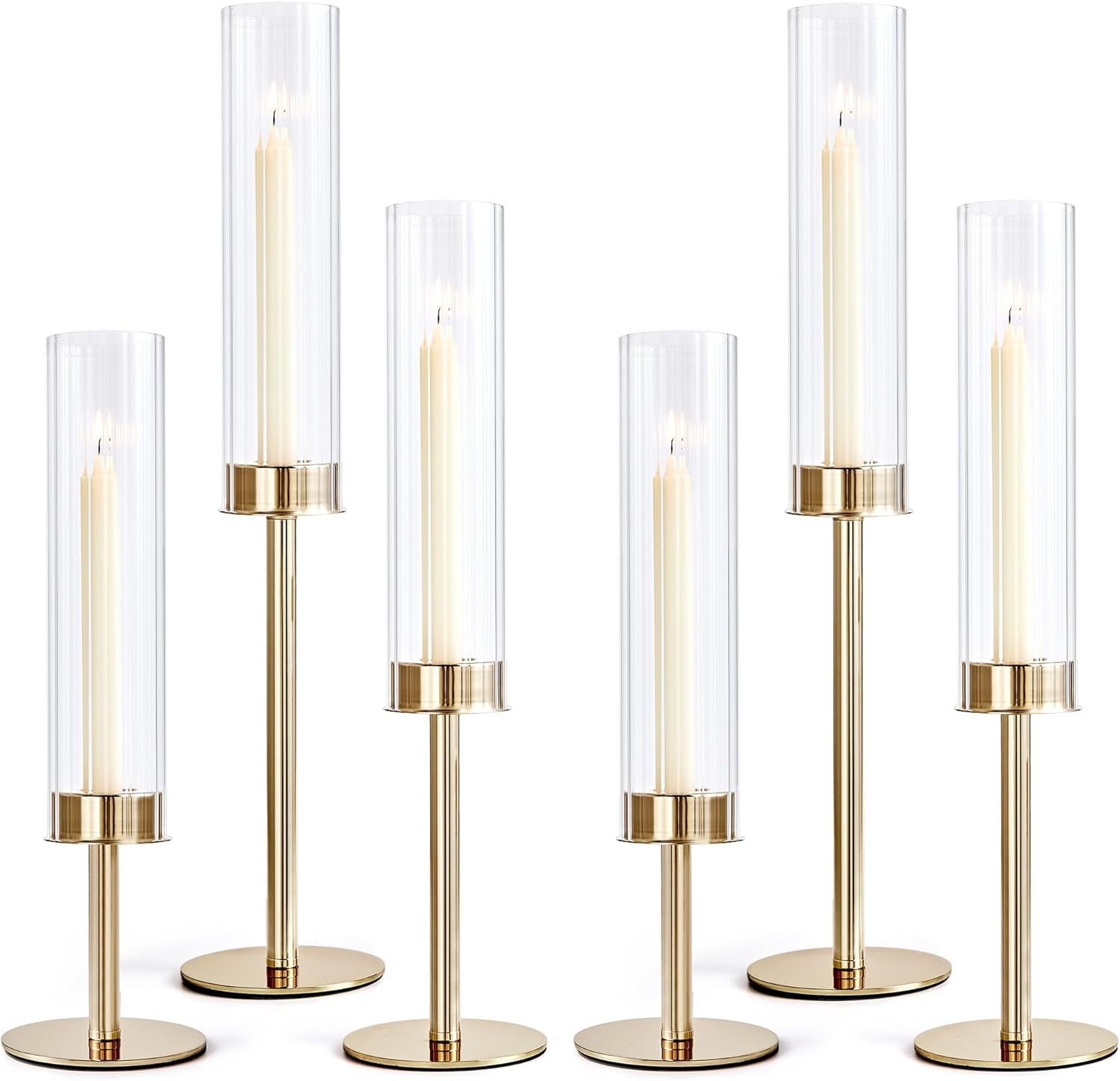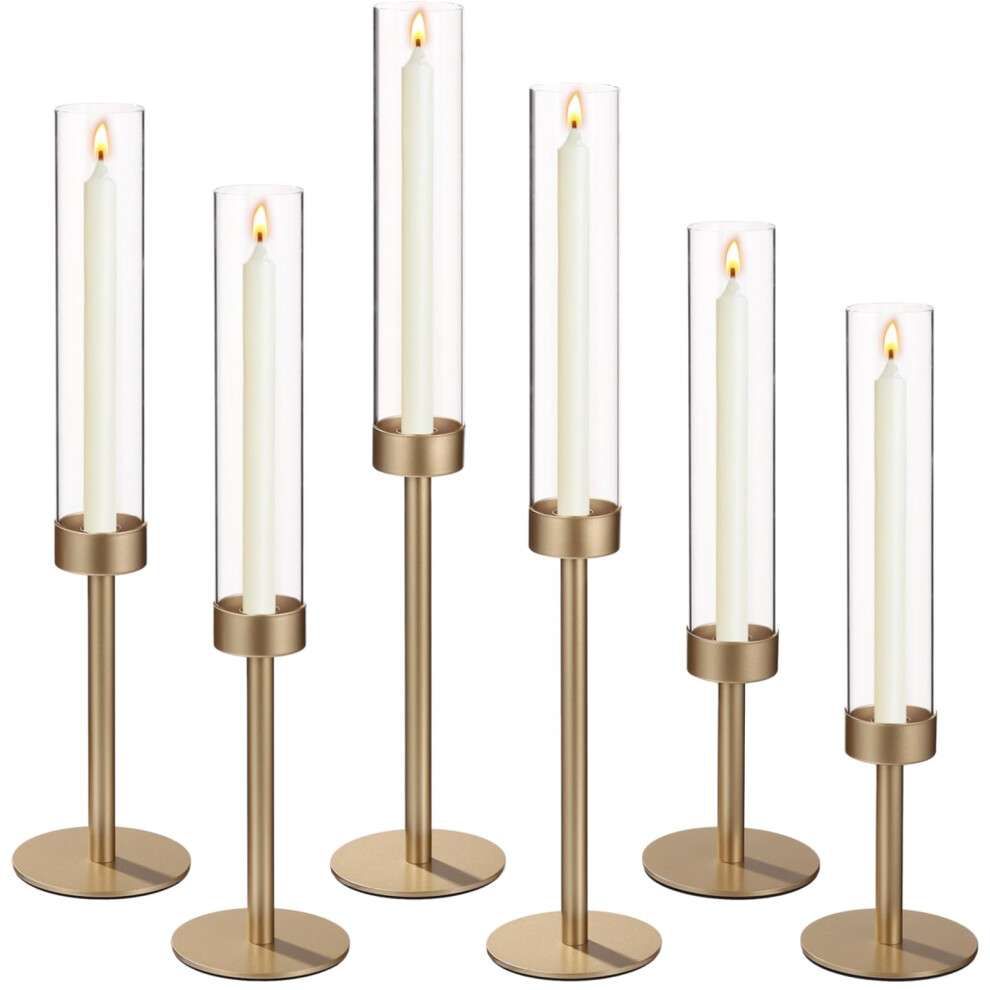 Basitys Tall Hurricane Candle Holders Set of 6 Metal Candlestick Holder for Glass Taper Candles with Crystal Chimney Tube Dining Table Mantel Christmas Home Decor (6, Gold)