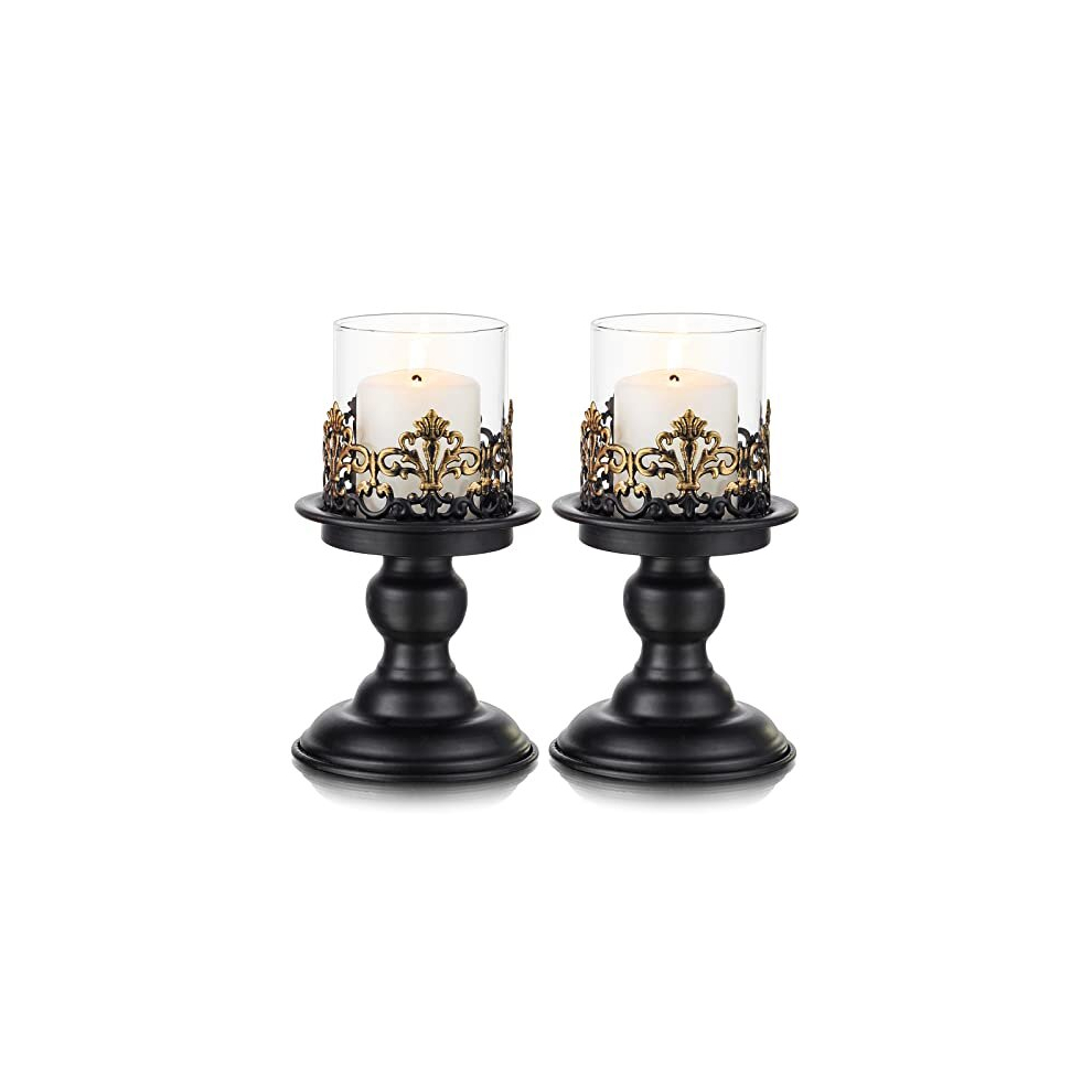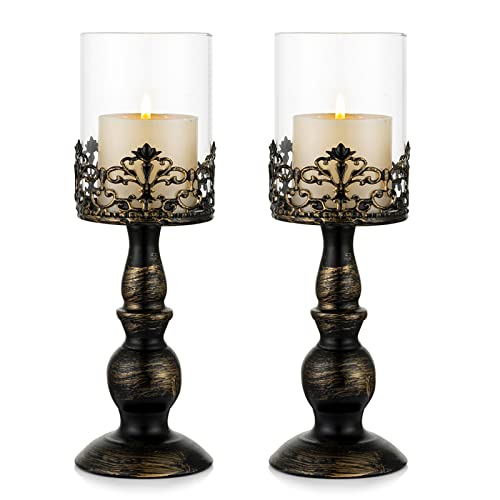 Vintage Gothic Glass Hurricane Candle Holders with Black Metal and Gold Accents, Set of 2 for Pillar Candles