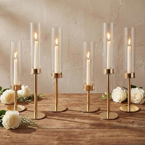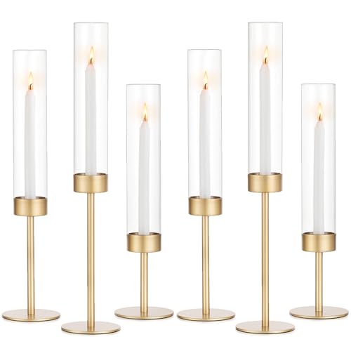 Sziqiqi Wedding Candlestick Holders Tall: 6 Pcs Gold Candle Holders Centerpiece for Table - Vintage Candle Sticks Holder with Glass Hurricane for Christmas Birthday Party Anniversary Decor