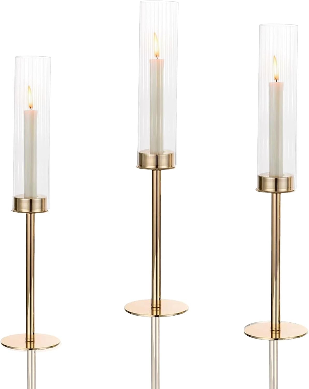 NUPTIO Tall Candlestick Holders for Centerpiece: 3 Pcs Hurricane Candles Holder with Ribbed Glass Sleeve - Gold Metal Candle Stick Holders for Table Fireplace Living Room Decor