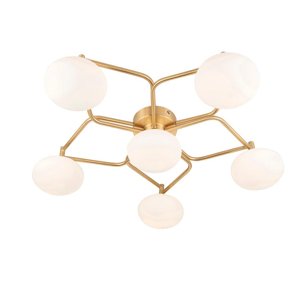 Satin Brass Geometric Flush Ceiling Light - Opal Glass Shades - 6 Bulb Fitting