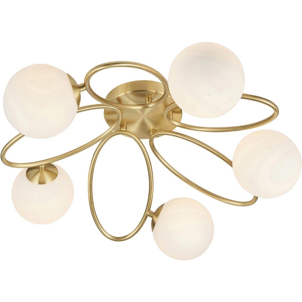 Semi Flush Multi Arm Ceiling 5 Light Fitting - Satin Brass & Opal Glass Shades