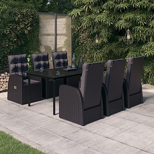 LoogCape 7-Piece Garden Dining Set Black with Adjustable Rattan Chairs, Glass Table and Comfortable Cushions, Ideal for Patio and Balcony