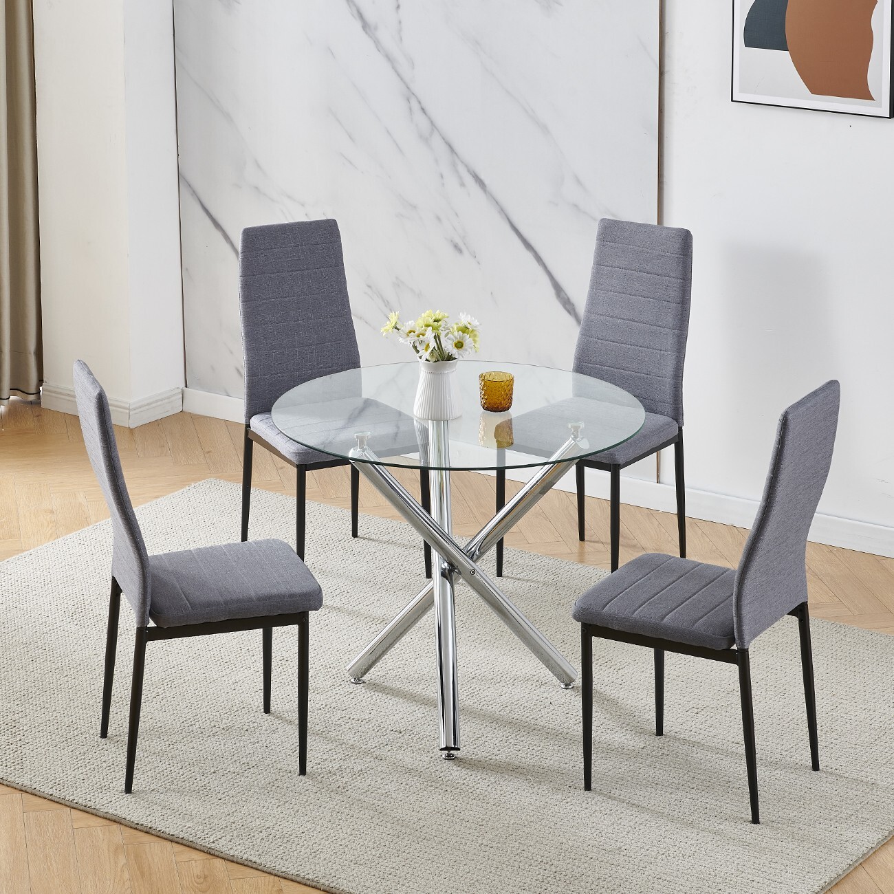 5 Pieces Round Glass Dining Room Set Black, Modern Round Dining Table with 4 Chairs, Glass Kitchen Table and Chairs for Home Kitchen and Apartment (W/124 Grey Chairs)