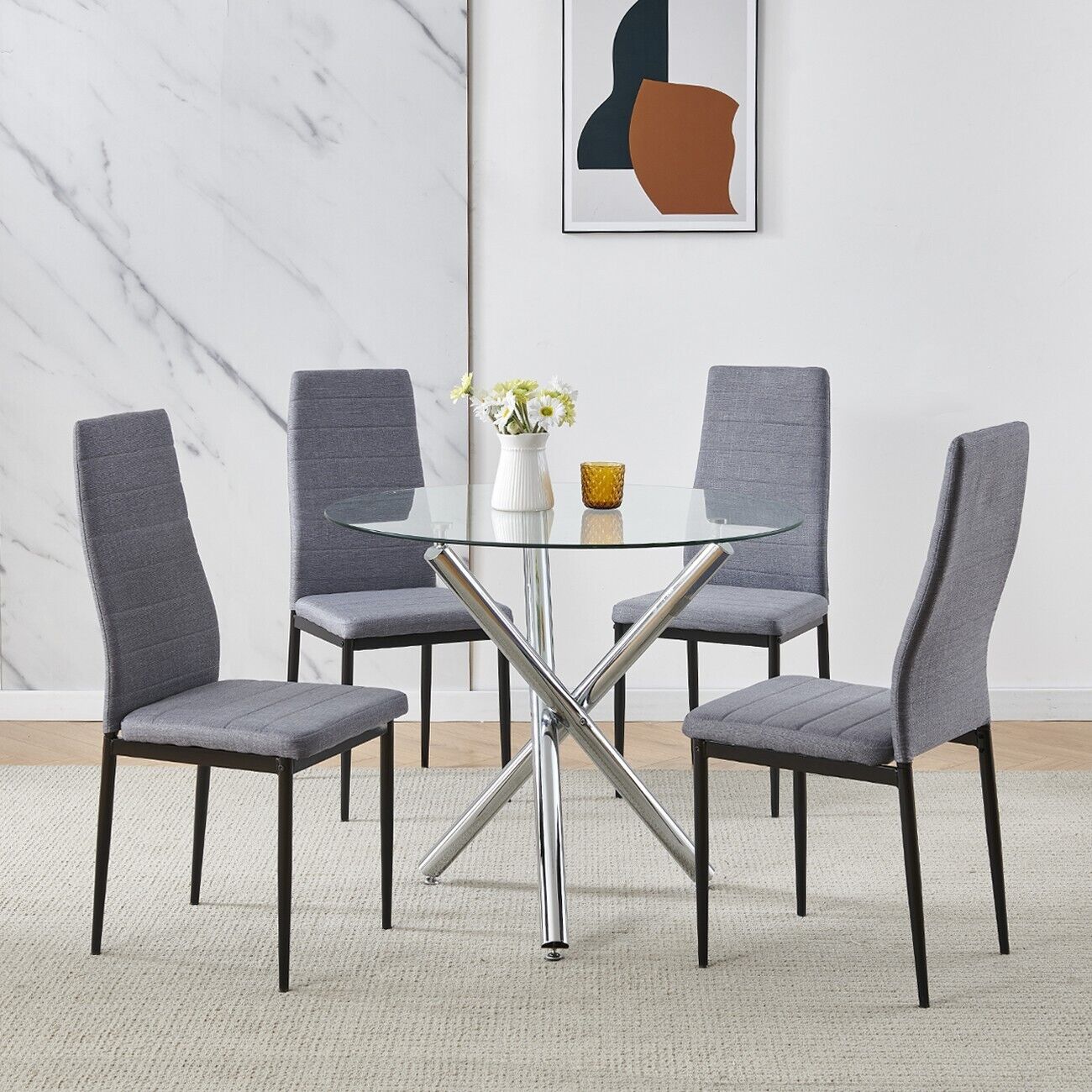 Furniturebox UK Dining Set - Novara Round Dining Table and Milan Chairs Set Of 4 - Modern Dining Table Silver Chrome Legs, Table with 4 Dining Chairs (Glass Dining Table + 4 Grey Chairs)