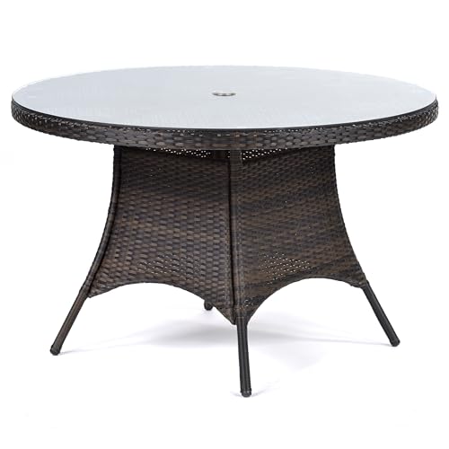 BrackenStyle Ascot 110cm Round 4 Seat Rattan Outdoor Table with Glass Top - 1.1 Metre Diameter Circular Garden Dining Table - Black/Brown Weather Resistant PE Rattan Weave