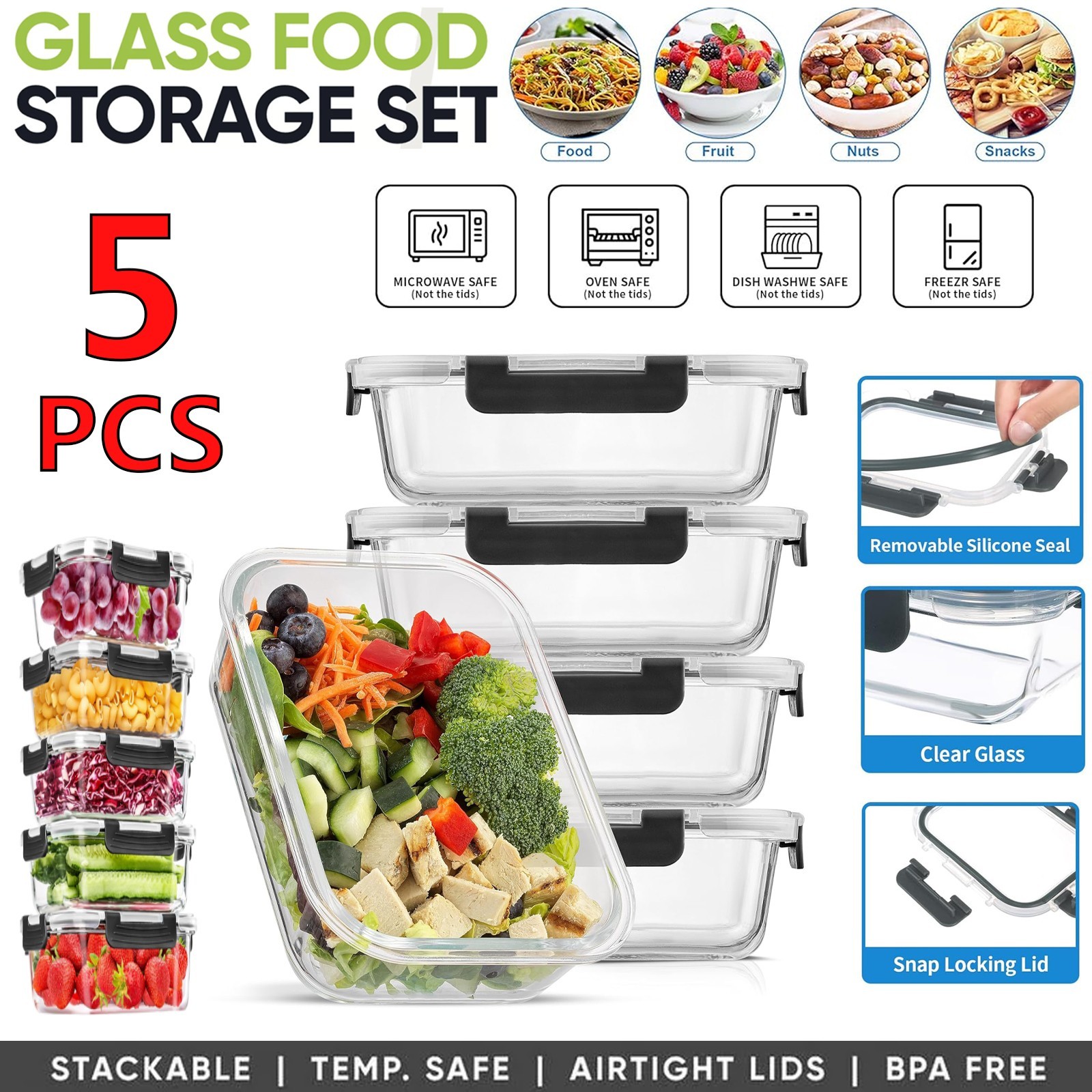 5x Glass Food Containers Airtght Lids Microwave Freezer Meal Prep Storage Box