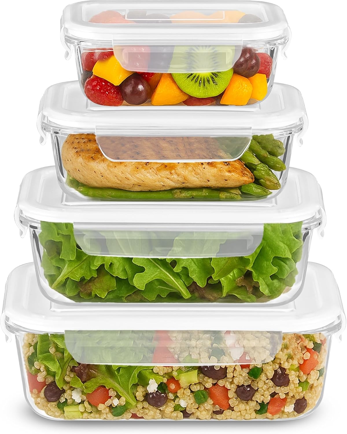 8Pcs Glass Storage Food Containers Airtight Lids Kitchen Meal Prep Containers