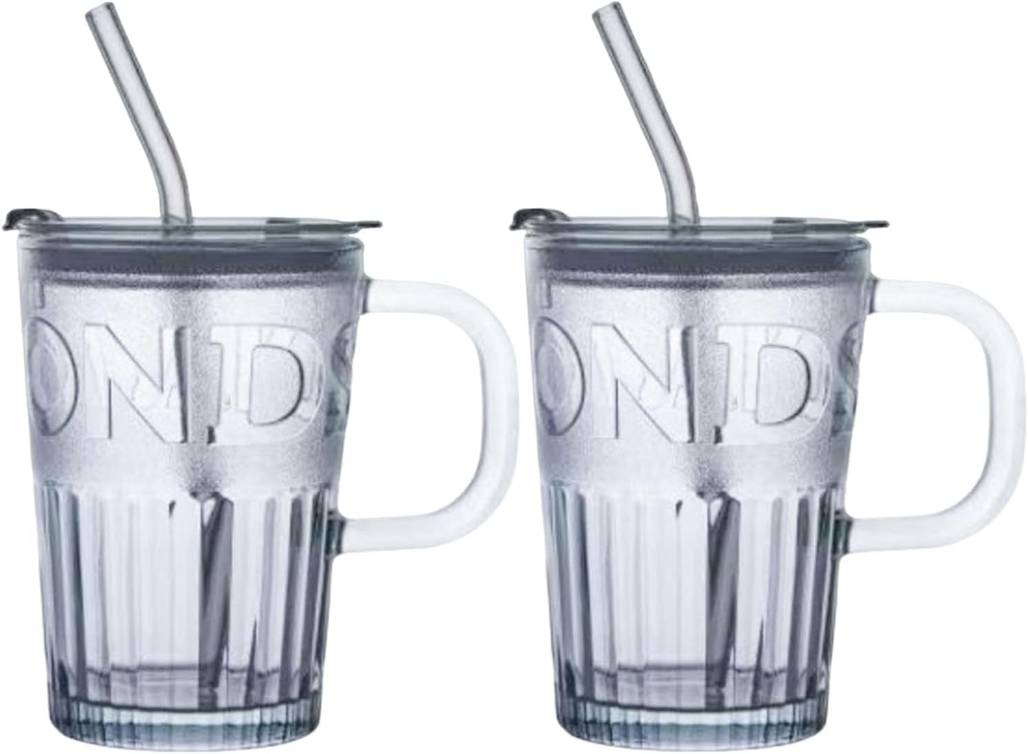 2 x 600ml Stripe Glass With Lid And Straw Ice Coffee Mug Tea Cup Milk Water