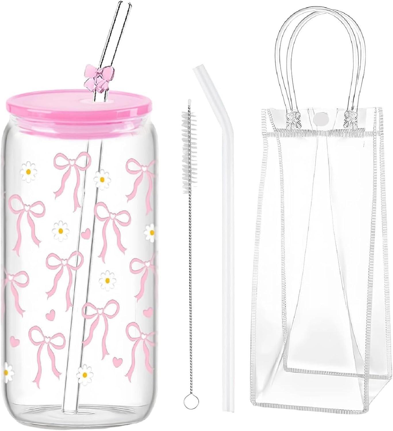 16oz Iced Coffee Glass Cup with Lid & Straw Cute Pink Flower Bow Design