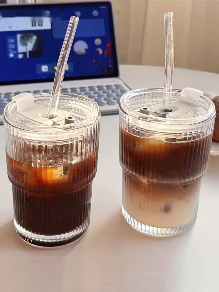 (a-with bend B 301-400ml) 375Ml Simple Stripe Glass Cup With Lid and Straw Transparent Bubble Tea Cup Breakfast Mug Juice Glass Beer Can Milk Mocha Cu