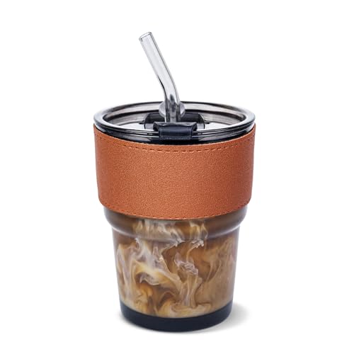 VAELORA Glass Coffee Cup with Lid, Straw and Protective Sleeve, Clear Borosilicate Travel Mug, Tumbler for Hot and Cold Drinks (Black Cup, Brown Sleeve)