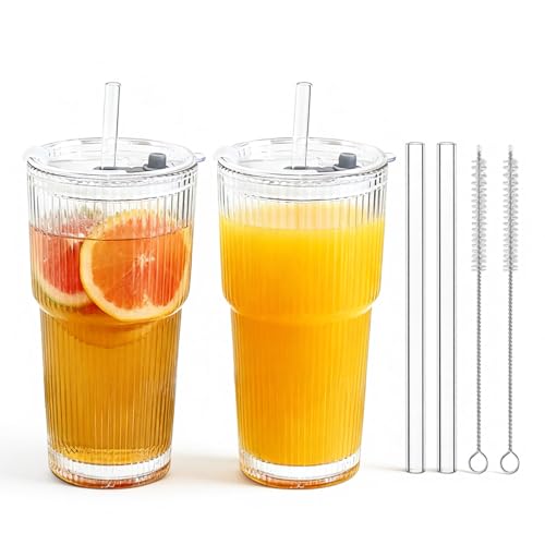 INSETLAN 2PCS 600ML Ribbed Glass Tumblers with Lids and Glass Straws, Leakproof Glass Cups, Coffee Glasses, Iced Coffee Cup, Glass Tumbler with Straw and Lid for Iced Coffee, Cocktail, Tea, Smoothie