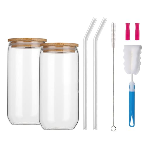 DYUEE Drinking Glasses with Wooden Lid and Glass Straw 2 PCS 500ml/17oz Iced Coffee Cup Transparent Can Glass Cups with Silicone Suction Nozzle, for Milk Coffee Ice Water