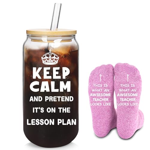 ANOTION Teacher Gifts,Glass Cup with Lid and Straw 18OZ,Thank You Gifts for Teachers,Personalised Gift Mug Iced Coffee Cup Appreciation Gifts Set with Pink Socks,A Special from Students to Teachers.