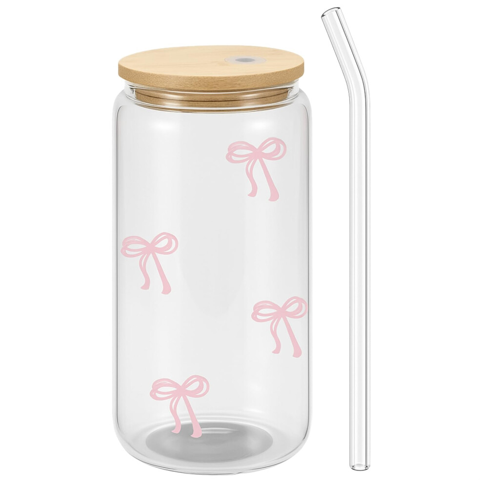 Bow Glass Cup with Lid and Straw, 500 Ml Iced Coffee Cup Set, Pink Cute Glass Cu