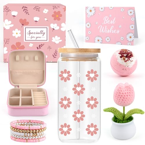 Gifts for Girls Teenage 8 9 10 11 12 13 14 15 Year Old, Valentines Birthday Gifts for Girls Women Age 8-16 Daughter Sister Friend Niece, Glass Cup with Lid Straw, Bracelets Jewelry Box Knitted Flowers