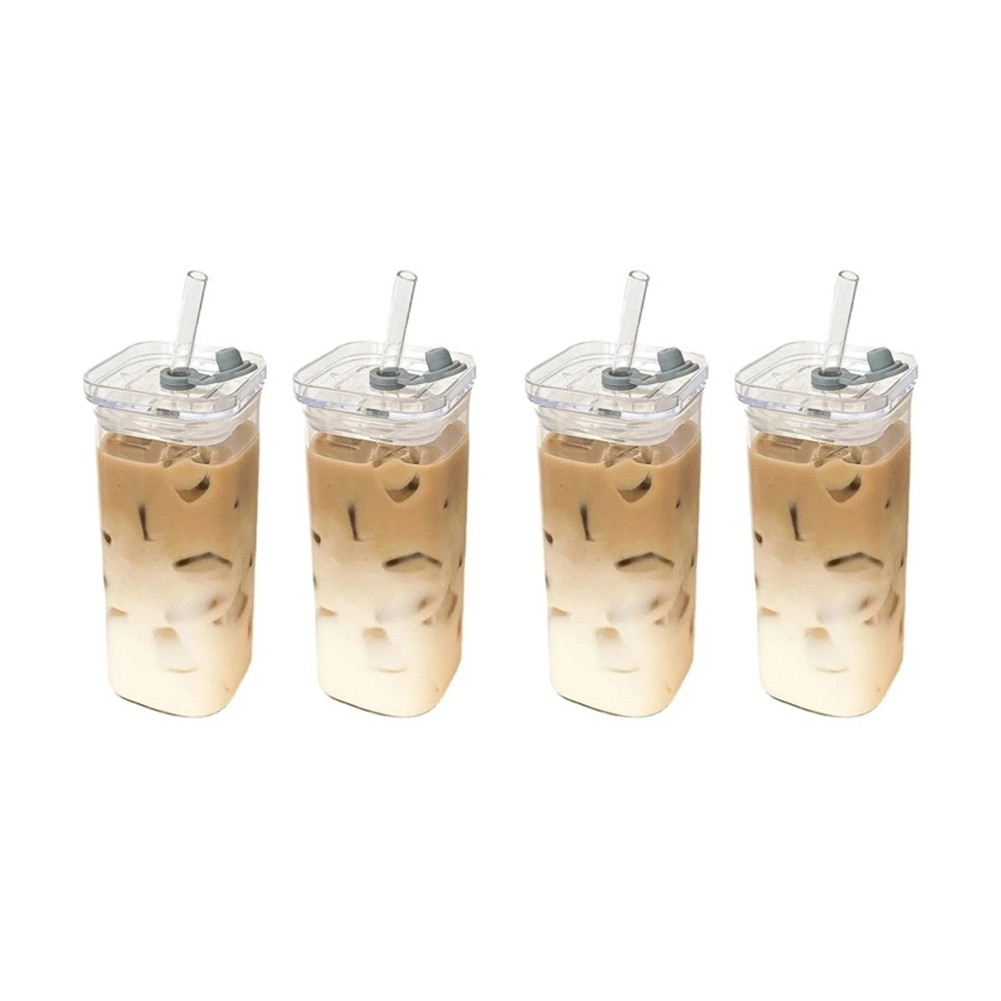 1Pcs Square Heat Resistant Coffee Glass Cup with Lid and Straw Transparent Milk