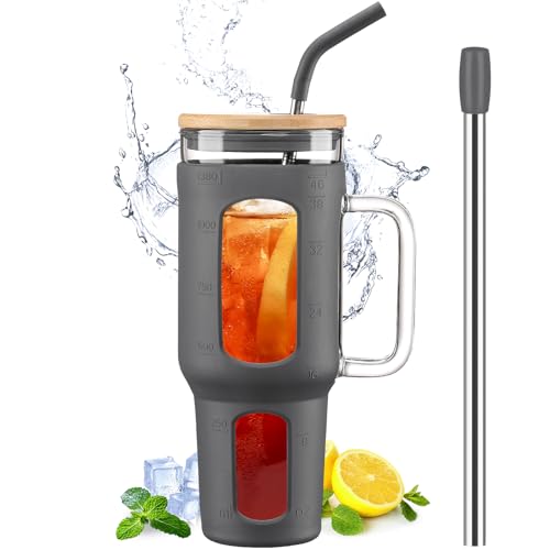 BLUEGO Glass Tumbler with Lid and Straw, 1400ml Iced Coffee Cup with Handle, Borosilicate Water Bottles with Silicone Sleeve, 1.4L Drinking Cup with 2 Straws, BPA Free,Grey