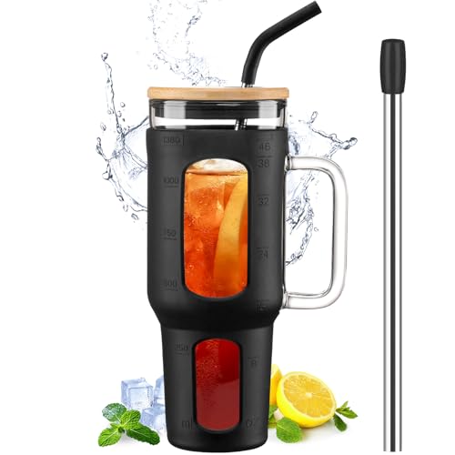 BLUEGO Glass Tumbler with Lid and Straw, 1400ml Iced Coffee Cup with Handle, Borosilicate Water Bottles with Silicone Sleeve, 1.4L Drinking Cup with 2 Straws, BPA Free, Black
