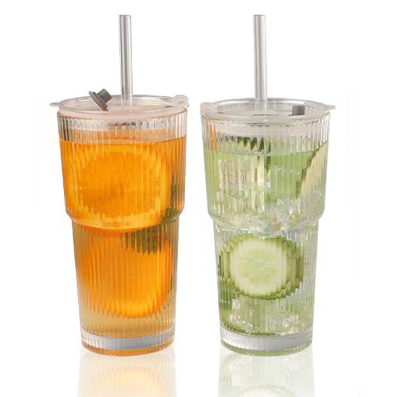 2 Pack 600ml Stripe Glass With Lid And Straw Ice Coffee Mug Tea Cup Milk Water