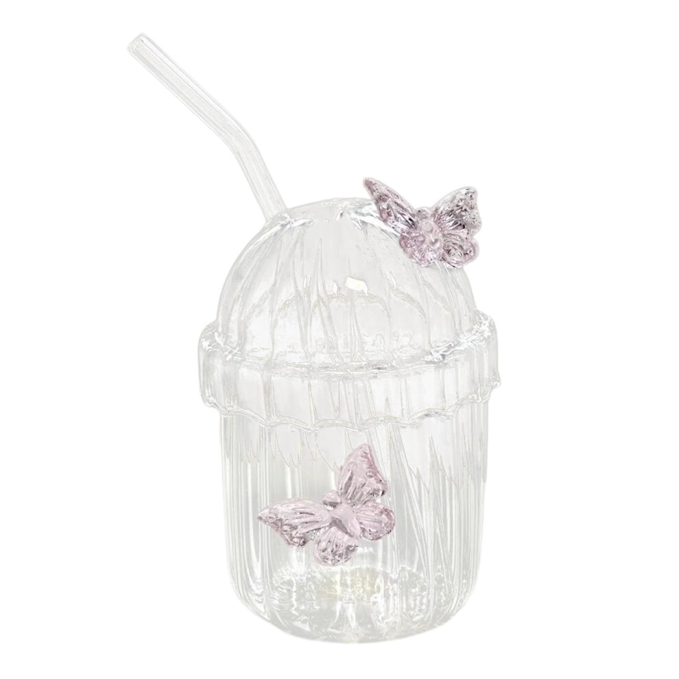 Glass Coffee Cup with Lid and Straw, 400ml Striped Butterfly Design for Hot and Cold Drinks