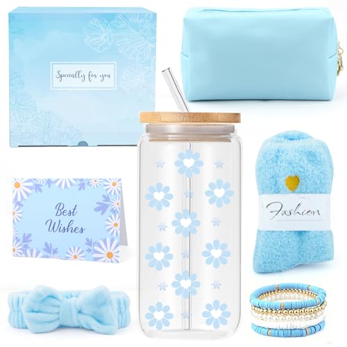 Gifts for Girls Teenage 8 9 10 11 12 13 14 15 Year Old, Birthday Valentines Day Gifts for Girls Women Age 8-16 Daughter Sister Friend Niece, Daisy Glass Cup with Lid Straw, Cosmetic Bag Hairband Socks