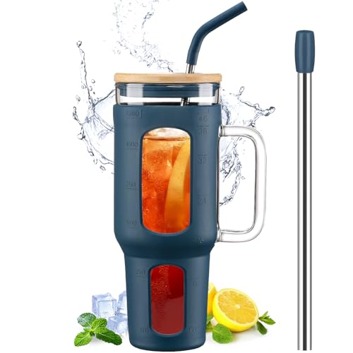 BLUEGO Glass Tumbler with Lid and Straw, 1400ml Iced Coffee Cup with Handle, Water Bottles with Silicone Sleeve, 1.4L Juice Cup with 2 Straws, BPA Free, Blue