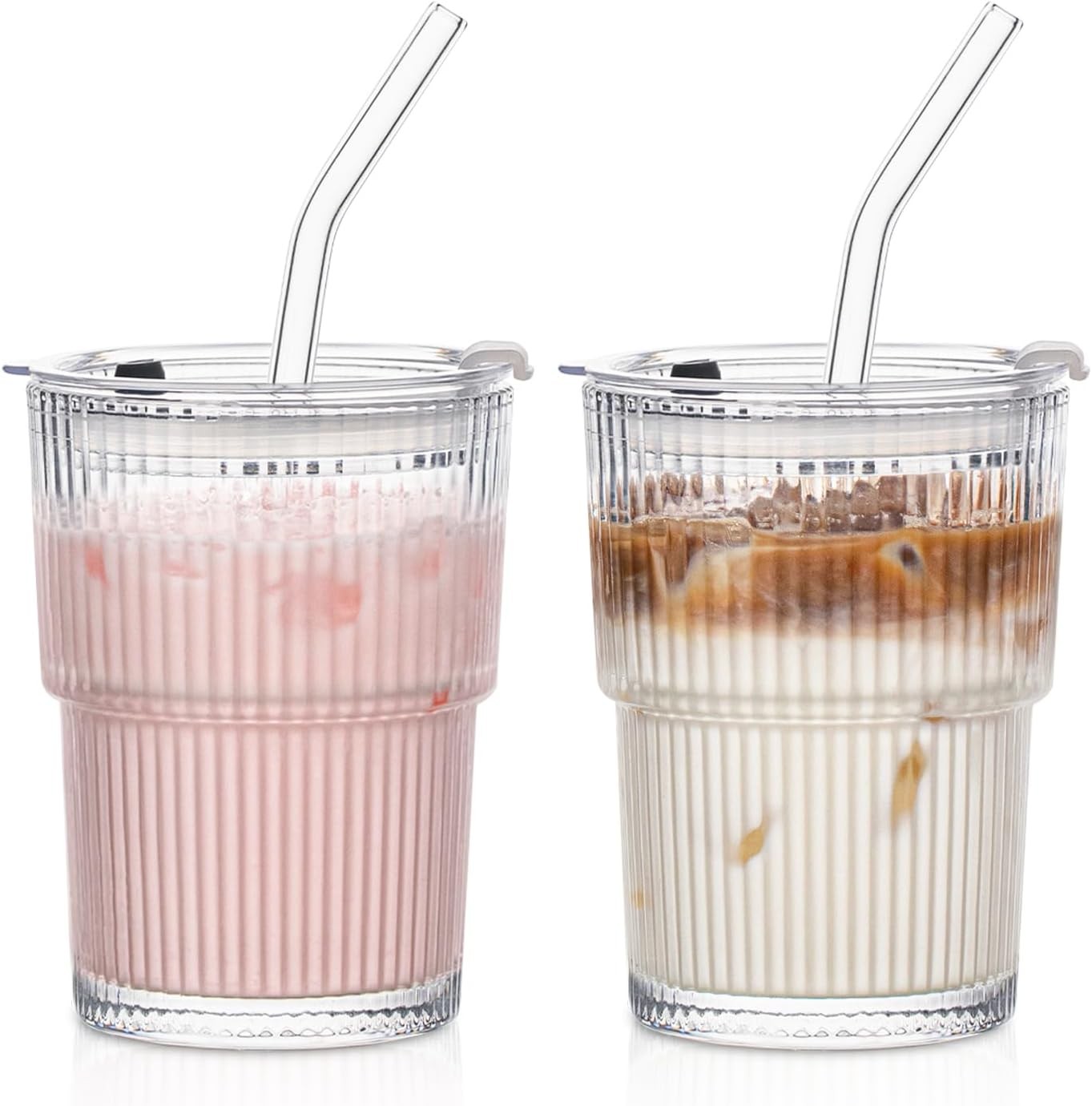 INSETLAN 380ml Glass Tumbler with Lid and Straw 2 Pack - Ribbed Glass Cup Iced