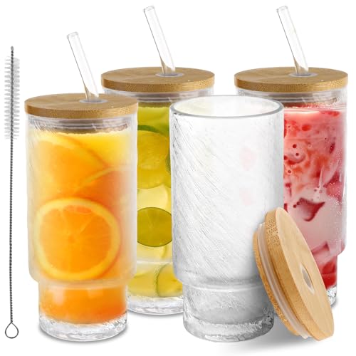 LOPYXBR 4 Pack 11oz Glass Cups with Lids and Straws, 320ml Glass Tumbler with Straw and Lid, Iced Coffee Cup Glasses with Cleaning Brush, Ice Coffee Glasses for Juice, Soda Water, Cocktail, Whiskey
