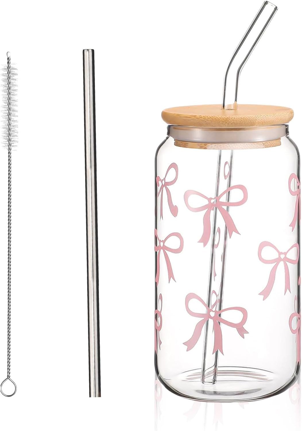 Aesthetic Drinking Glass with Straw and Lid, 16 Oz Butterfly Bow Glass Cup with