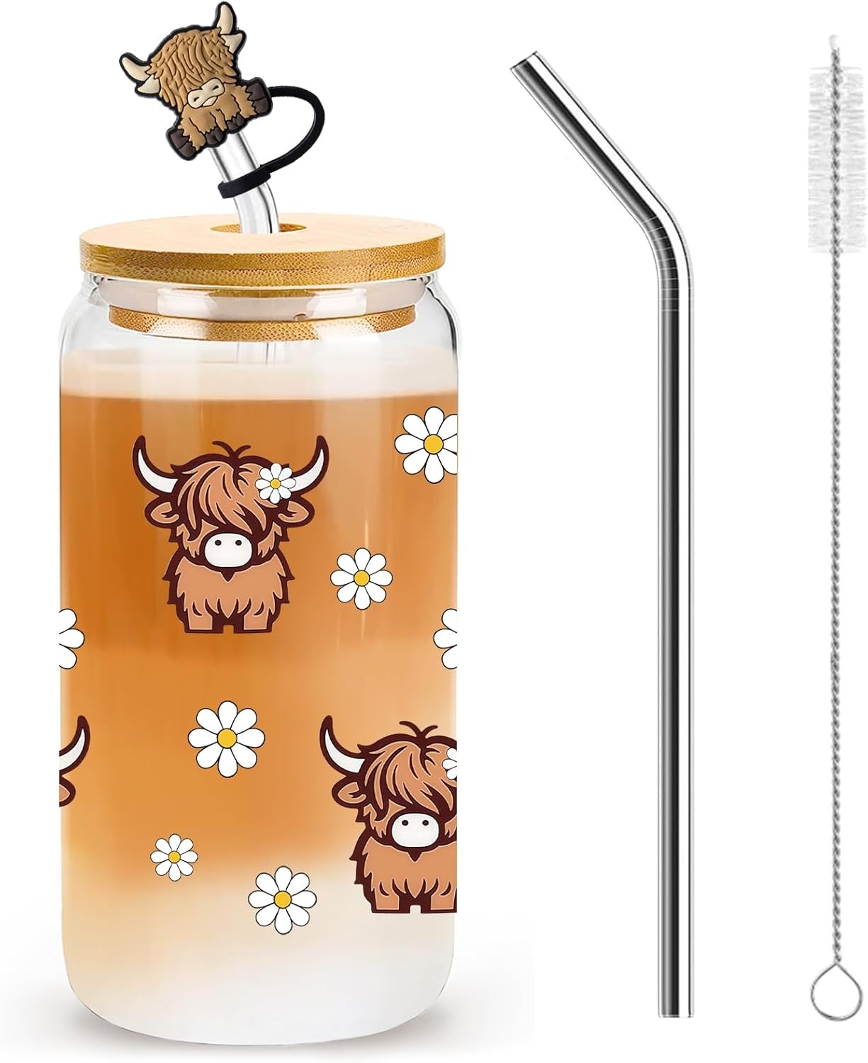 Highland Cow Glass Cup with Lid and Straw, 16oz Cute Tumbler for Iced Coffee, C