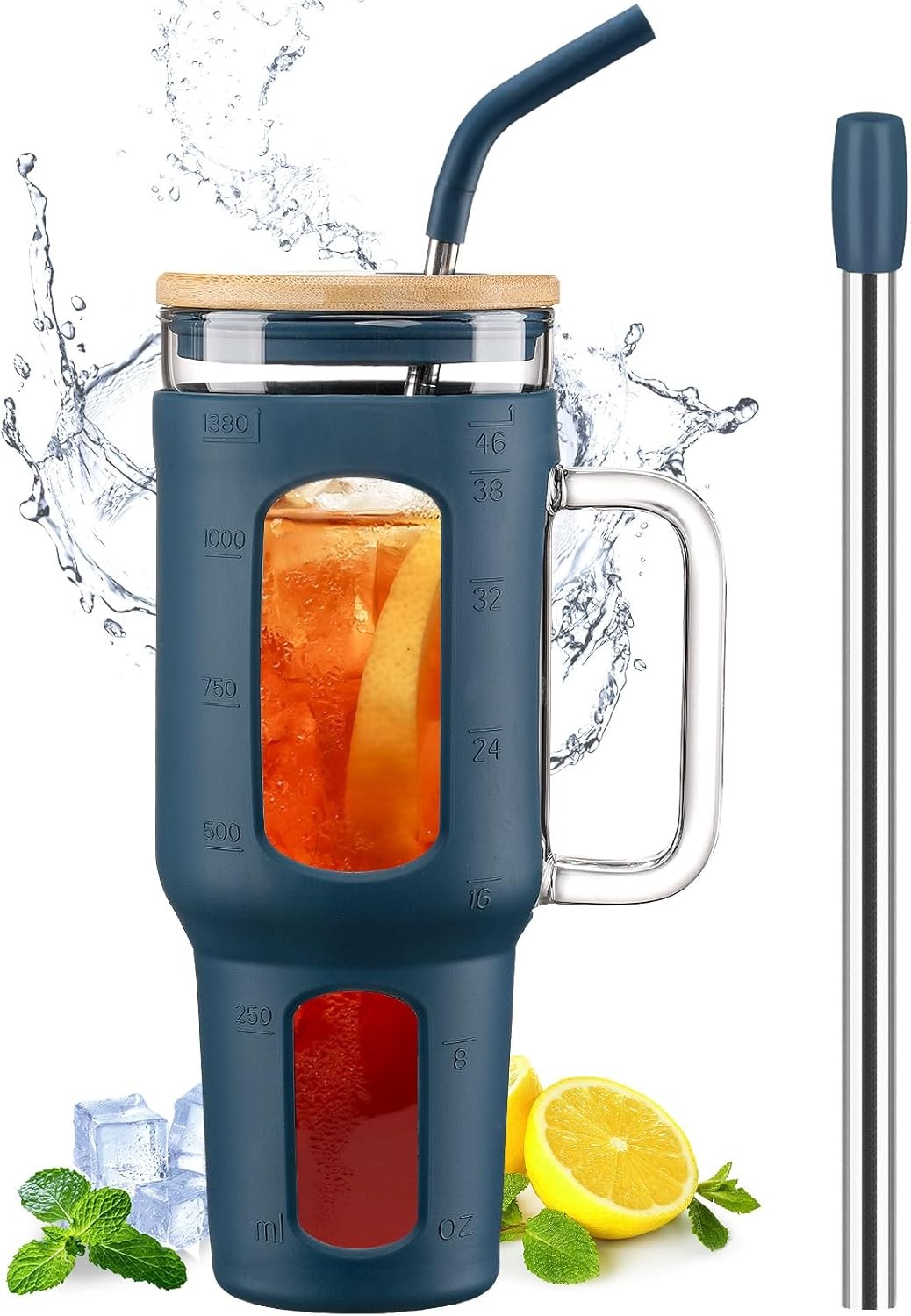 BLUEGO Glass Tumbler with Lid and Straw, 1400ml Iced Coffee Cup with Handle, Bo