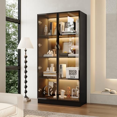 Glass Display Cabinet with LED Lights - 4-Tier Double Door Curio Cabinet with Lock, Frameless Tall Showcase Display Shelf for Collectibles and Figurines, Living Room Bookcase Storage Cabinet, Black