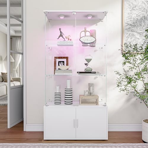 LSFYYDS Dual Door, 3-Tier White Glass Display Cabinet with LED Lights & Lock - Sturdy Glass & Wood Collectibles Display Shelf for Living Room, Bedroom, Office, Bookcase Storage Cabinet
