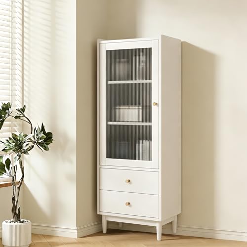 Fukaio Tall Bookcase With Fluted Glass Door & 2 Drawers, Modern Storage Cabinet With Tempered Glass, Narrow Wood Bookshelf Organizer For Home Office, Living Room, Kitchen Pantry(White,4-Tier)